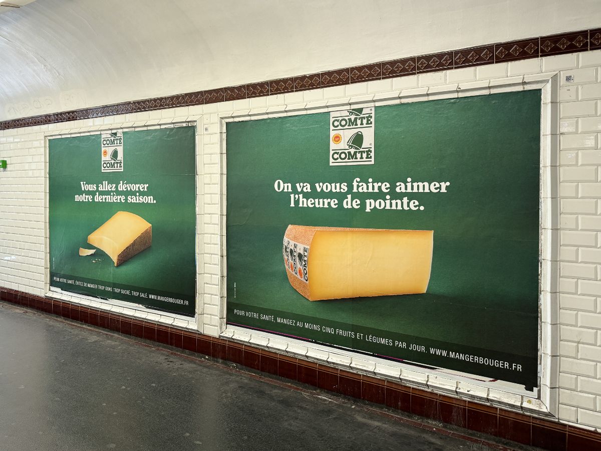 Des visuels simples mais percutants, une esthétique soignée et un ton humoristique, mettant en avant le fromage emblématique du Jura. Une meule entière de 24m² affichée sur les quais, représentée par deux affiches de 3 m² côte à côte, accompagnée de jeux de mots contextualisés tels que « On va vous faire aimer les heures de pointe ». Une campagne qui casse les codes de la communication fromagère traditionnelle.