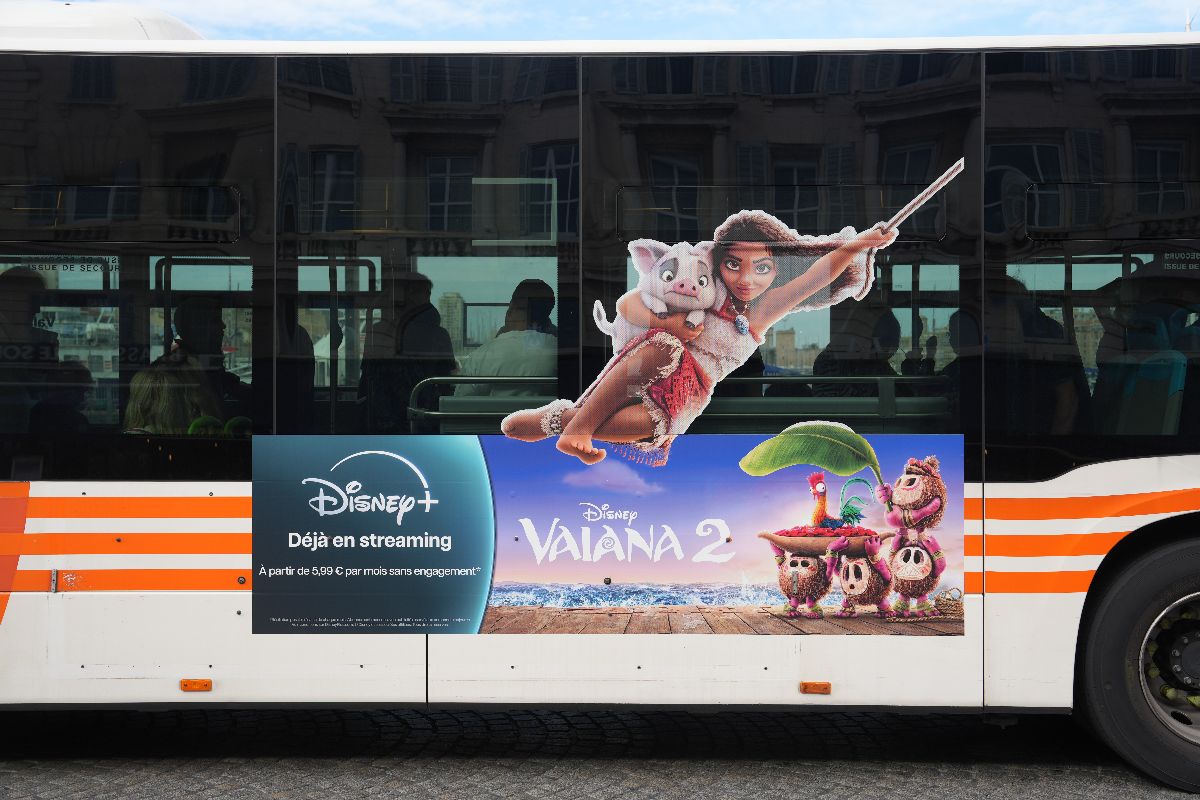 Une campagne adhésivée déformatée sur les bus de Marseille qui met en avant un jeune Mufasa curieux de ce qui l’entoure et une Vaiana au regard déterminée, s’élançant sur une liane à l’aventure.