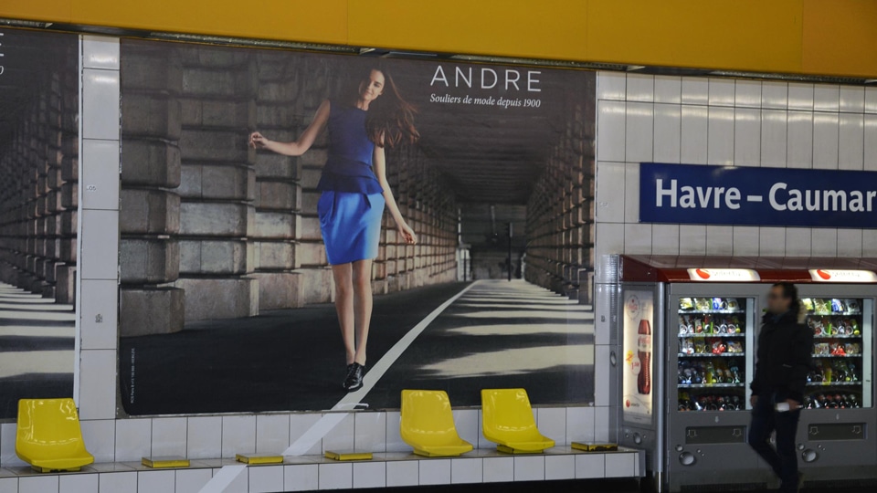 Sur 3 stations emblématiques du shopping parisien, Saint-Lazare, Chaussée d’Antin et Havre Caumartin, la marque André guide les voyageurs du métro jusqu’à son magasin le plus proche grâce à la ligne blanche, emblématique de sa nouvelle campagne d’affichage.