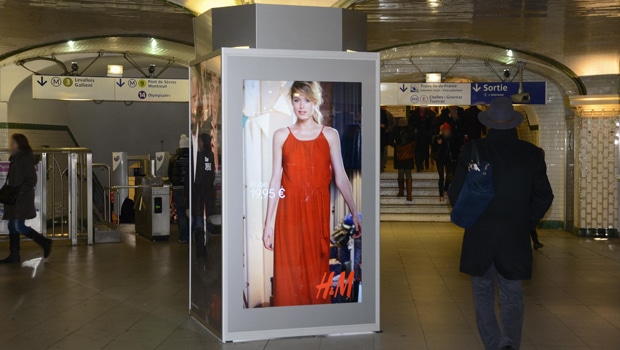 Du 29 novembre au 26 décembre 2013, la salle de la rotonde est habillée aux couleurs de la célèbre marque de prêt à porter : les 8 piliers de la salle bénéficient d’un adhésivage rétroéclairé et 4 écrans digitaux 80 pouces diffusent les silhouettes de la collection Hiver H&M. Un dispositif exceptionnel mêlant digital et adhésivage avec succès !