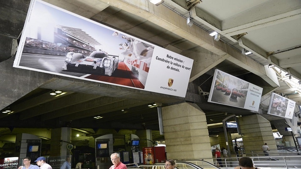 Les adhésifs de la Gare du Mans, les 3 toiles et les 2 faces du Hall Vasarely de la Gare de Paris Montparnasse reprenaient les slogans de Porsche :