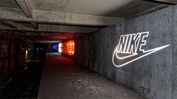 Habillée pour l’occasion de néons présentant le logo de la marque, le nom et la date de l’évènement, la station met également en scène des bulles d’air géantes, élément caractéristique de la Air Max.