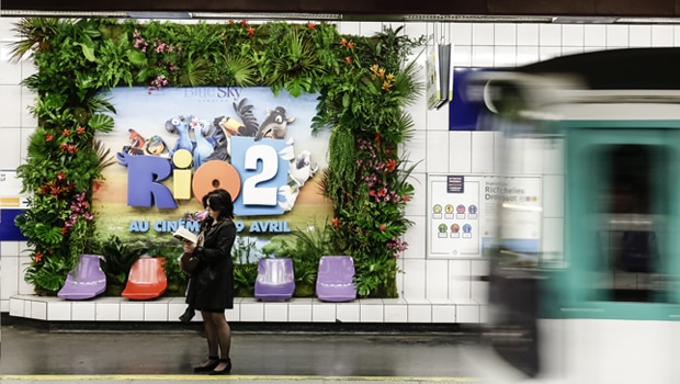 Sur une idée de l’agence ubi-bene et en partenariat avec METROBUS, 4 panneaux 12m² annonçant la sortie du film sont « végétalisés » avec de véritables plantes et fleurs exotiques. Un avant-goût du décor de « Rio 2 » offert au Parisiens, donnant ainsi l’impression que la nature a repris ses droits… même sous terre !