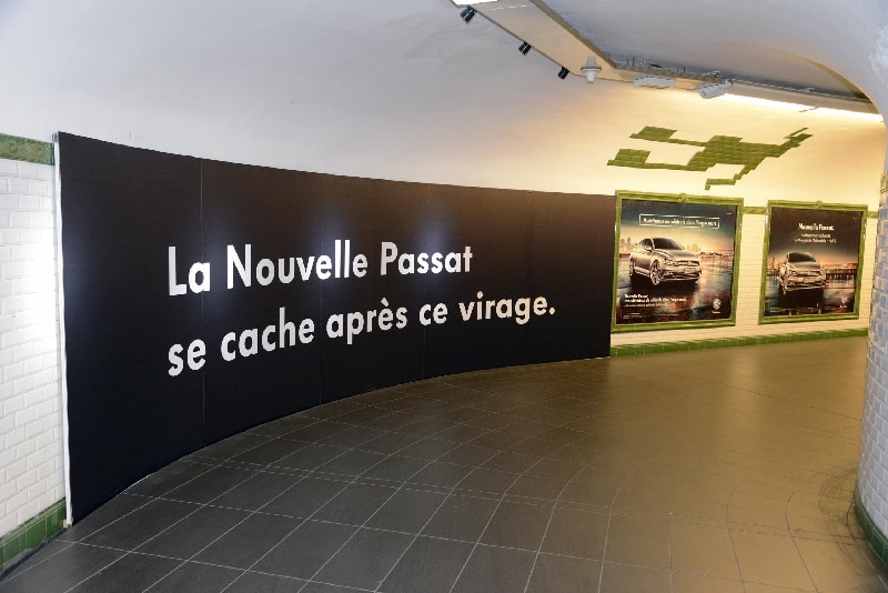 A l’occasion du mondial de l’automobile, Volkswagen a privatisé l’ensemble des dispositifs Event et affichage de la Porte de Versailles ainsi que le tramway T2 visible dès la sortie du métro pour présenter sa nouvelle Passat au public.